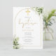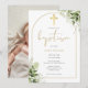 Med känsliga akvarell gröna blad och en elegant guldbåge och krucifix, kan denna snygga könsneutrala dopinbjudan anpassas med din speciella information och foto på baksidan. Designad av Thisisnotme©