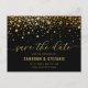 Inbjudan familj och vänner till bröllop med anpassade spara datum meddelande i elegant. Den har faux guld-foil-konetti-punkter, elegant-skript och enkel typografi. Anpassa den här svarta och guld-moderna versionen för att spara datumvykortet genom att lägga till namn, datum och annan information. Den här faux-guld-folien sparar det datum då vykortet är perfekt för alla bröllop-teman eller -säsonger.