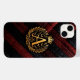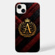 Ett dekorativt monogram av bokstav A i guld med en krona på en röd och svart texturerad vävd bakgrund, som förmedlar lyx, elegans och traditionella designelement perfekta för kungliga inspirerade teman.