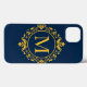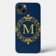 Gyllene monogramdesign med dekorativ blomsterform och invecklad ram på en rik blå bakgrund, som förmedlar lyx och sofistikering.