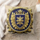 Intrikat gyllene prydnadskrona med en central sköld och blomsterdekorationer, som visar förfinad hantverk och klassisk design med medeltida influenser, på en kontrasterande mörk bakgrund för en elegant estetik.