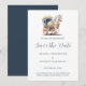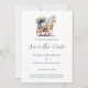 Elegant hästdroska bröllop Save the Date-kort. Vi gifter oss och ber er spara datumet för en elegant fest när vi utbyter löften omgivna av de rika nyanserna av ett romantiskt bröllop. Vårt bröllop kommer att innehålla en vacker hästdroska dragen av en vacker vit häst i romantiska blå färger, allt accentuerat av den tidlösa charmen hos script calligraphy. Dela årstidens värme och elegans med oss på denna speciella dag.