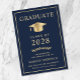 Elegant mörkblå universitetsavgångsmeddelande med en guldfärgad examensmössa och modern, enkel, ljusgul typografi för examenens namn, avgångsår, universitet eller högskola, examen och huvudämne eller utmärkelser.