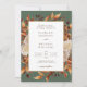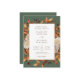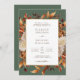 Elegant Höst löv bröllopsinbjudan. Den här inbjudan från elegant bröllop innehåller vackra, handmålade vattenfärger, bränd orange och terracotta löv, kräm och beige dahlias, och vacker rost och brunt ro mot en grönt, perfekt för en höst i bröllop! Baksidan av inbjudan har ett vackert gren av löv med briden och brudgummens monogram. Sök efter matchande objekt i Samlingen Sage Autumn Romantik Bröllop.