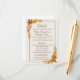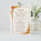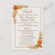 Fyll i din bröllop-svit med det här boendekortet för högskolebröllop, designat för att perfekt matcha dina höstinbjudningar. Med handmålade vattenfärgade löv i rik av orange, rött, gult och sage-grönt, framtagna av ett tunt, rustiskt brunt gräns, visar det här kortet både elegans och säsong charm. De redigerbara skriptrubrikerna för koppar ("Information", "Mottagning", "Bostäder") är utmärkta med ett tidlöst seriif-teckensnitt som garanterar tydlighet och sofistikering. Gästerna kommer att få all nödvändig information - från ceremoni och mottagningsinformation till hotellrum och bröllop webbplats - presenterad i ett stil som är lika spännande som din stora dag. Det här kortet är perfekt för fallbröllop, rustik firande eller elegant land, och är helt anpassade. Det skapar det lätt att samordna med hela din bröllop-kontorssvit.