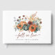 Denna design har en arrangemang av eleganta akvarellpumpor och höstblommor och lövverk. Perfekt för rustika höstbröllopsfester.