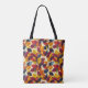 Elegant höstshoppingväska med lagerblad av varma nyanser i gyllene gult, bränt orange, djuprött och mjuka marinblå accenter. Den ljusa bakgrunden framhäver de rika säsongsfärgerna och skapar ett raffinerat botaniskt mönster inspirerat av mysiga höstdagar.