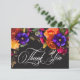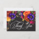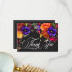 Omfamna den överdådiga skönheten i en höstlig blomsterfest med vårt fängslande tackkort för bröllopsfest. En dramatisk, men mjuk svart bakgrund ger den perfekta duken för en hisnande realistisk bukett. Föreställ dig en livfull explosion av färg, med rosor i orange och mörk magenta, små magenta rosa blommor och lila violer och bredvid persika krysantemum och andra livfulla blommor. Frodig, mörkgrön lövverk fullbordar arrangemanget och tillför en touch av naturlig elegans. Denna fängslande design är perfekt för alla årstider och speglar den passionerade intensiteten i er kärlekshistoria. Ett elegant, vintage-typografi tillkännager er kort, medan ert tackmeddelande visas i elegant typografi, vilket får det att sticka ut vackert mot den dramatiska bakgr