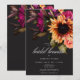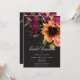 Omfamna den överdådiga skönheten i en sommarsolnedgång eller de rika färgerna under en höstskörd med vår fängslande bröllopsbrunch-inbjudan. En dramatisk, men mjuk svart bakgrund ger den perfekta duken för en hisnande realistisk bukett. Föreställ dig en livfull explosion av färg, med krysantemum i djup magenta och lila, mjuka rosa rosor och djärva gyllene orange solrosor. Frodig, mörkgrön lövverk fullbordar arrangemanget och tillför en touch av naturlig elegans. Denna fängslande design är perfekt för alla årstider och speglar den passionerade intensiteten i er kärlekshistoria. Era evenemangsuppgifter visas i elegant skrivstil och sticker ut vackert mot den dramatiska bakgr