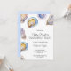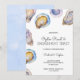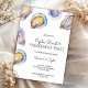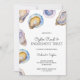 Inbjudningskort för en ostronfest och förlovningsskål med akvarell ostronskal på en marmorerad bakgrund. Namn och evenemangsinformation är elegant tryckt.