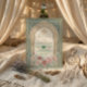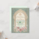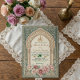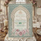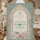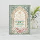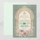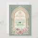 Set the tone for your special union with this exquisite Moroccan-inspired design, featuring soft dusty rose florals, teal accents, and rich golden details.This sophisticated composition centers on a traditional Moorish archway framed by intricate architectural pillars. The visual hierarchy balances a rich teal and cream ivory palette with delicate, hand-painted watercolor botanical borders in shades of blush and dusty rose. Simulated metallic accents highlight the central script, providing a warm contrast against the matte-style background layout.This is a flat printed image with a faux gold foil and watercolor effect, not actual raised material.