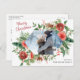 Denna vackra God Jul vykort har eleganta akvarell röda blommor med julholberry, kottar, grönska och ett foto. Baksidan av vykortet har matchande konstverk och ett meddelande för anpassning. Hitta matchande föremål i Holiday Red Winter Botanical Christmas Collection.