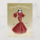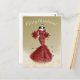 Elegant illustration av en modern kvinna i en röd fullt i ro. Bakgrunden är ett gnistrande guld. Ord "God jul!" skrivs i ett trendig-kalligrafi. (c) Janin F.).