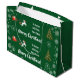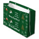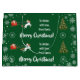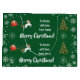 Modern, elegant och söt julklapp för barn med ord "God jul" i snyggt-typografi, en personlig som nu lyder "To Amber / with kärlek / from Santa," snöflingor, en illustration av en enhörning (med rött och gyllene mane och svan) som drar tomten i sömnen och Julafton träd. På gröntens bakgrund med snöflingor.