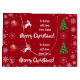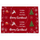 Modern, elegant och söt julklapp för barn med ord "God jul" i snyggt-typografi, en personlig som nu lyder "To Amber / with kärlek / from Santa," snöflingor, en illustration av en enhörning (med rött och gyllene mane och svan) som drar tomten i sömnen och Julafton träd. På en röd bakgrund med snöflingor.