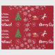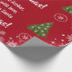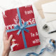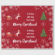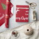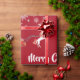 Modern, elegant och söt julklapp med ord "God jul" i snyggt typografi, en personlig som nu lyder "To Amber / with kärlek / from Santa," snöflingor, en illustration av en enhörning (med rött och guldmane och svan) som drar tomten i sömnen och Julafton träd. På en röd bakgrund med snöflingor.