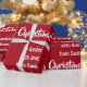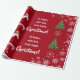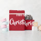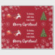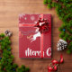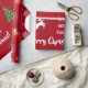 Modern, elegant och söt julklapp med ord "God jul" i snyggt typografi, en personlig som nu lyder "To Amber / with kärlek / from Santa," snöflingor, en illustration av en enhörning (med en mane och svan med rött och guldfärgat glitter) som drar tomten i sömnen och Julafton. På en röd bakgrund med snöflingor.