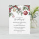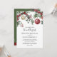 Rustika inbjudningar till vinterbröllop med enkel vit bakgrund, festliga akvarellblommor och löv, röda och gyllene julgransprydnader och en elegant bröllopsmall som är lätt att anpassa.