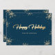 Eleganta blå och gula julkort med snöflingor och snö på en blå bakgrund. En vacker handskriven titel med guld folieeffekt i mitten. Personalisera enkelt dessa blå och gula snöflinga julkort med ditt familjenamn och meddelande. Anpassade förfrågningar är välkomna.
