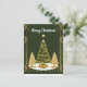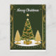 En festlig illustration med ett gyllene julgran dekorerat med ornament, omgivet av dekorativa snöflingor och festliga element, mot en mörkgrön bakgrund, som inger värme och säsongens glädje.