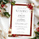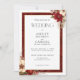 Denna romantiska och klassiska bröllopsinbjudan innehåller kluster av röda och vita vinterblommor, gräs, hullbär och rustiska kvistar anpassningsbar modern textgrafik och redigerbar text fält omgiven av en röd rik gräns med guld kant. Baksidan har kompletterande grafik och blommigt fält för webbplatsen adress.