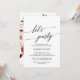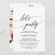Detta eleganta kalligrafi | blommiga bakgrund låt oss festa-inbjudningskort är perfekt för en höstfest. Designen har romantisk och lekfull typografi med en vacker bukett av skära rosa, marsala och vinröda blommor på baksidan.