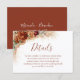 Fyll i din inbjudan med varm, jordnära sofistikering med det Eleganta Terrakotta Kalligrafi Boho Bröllopsdetaljkortet. Designat för moderna boho- och rustic-chic-firanden, har detta detaljerade inklusionskort rika terrakottafärger i par med graciös kalligrafitypografi. Den varma, solkyssta färgpaletten frammanar ökenromantik och naturlig elegans, vilket gör det perfekt för utomhusbröllop, vingårdslokaler, trädgårdsceremonier och sydvästinspirerade firanden. Detta bröllopsdetaljkort är idealiskt för att dela viktig information såsom: • Bröllopswebbplats • Instruktioner för RSVP • Boendeinformation • Klädkod • Transportinformation • Helgaktivitetsschema. Den rena layouten håller allt organiserat och lätt att läsa samtidigt som den bibehåller en mjuk, romantisk estetik. Det koordinerar vackert med bohemiska, terrakotta-, brändorange- och neutrala bröllopsinbjudningar för en sammanhängande och polerad presentation. Helt anpassningsbart med din person
