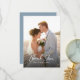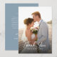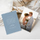 Vår eleganta dammiga blå fotobutiksbröllop tack-kort design är det perfekta sättet att dela tack med dina gäster efter din speciella dag. På framsidan finns ett fullständigt foto som överlagras med vacker vit kalligrafi-font med enkel text för en förhöjd look, som reflekterar din speciella fest. På baksidan finns vit text med ditt personliga meddelande, hälsning och namn på en dammig blå bakgrund. Lätt att anpassa för din egen perfekta dag.