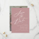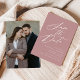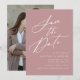 Elegant save the date med "Spara datum" som visas i ett vitt kalligrafiskt teckensnitt med en dammig rosa bakgrund. Anpassa save the date med era namn, bröllopsdatum och plats, samt er bröllopswebbplats. Lägg till ert fullbleed-fotografi i liggande format på baksidan av kortet. Designen för foto save the date koordinerar med vår Elegant Calligraphy bröllopssamling.