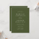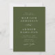 Inbjudan till elegant bröllop som innehåller uppgifter om namn och bröllop i vitskrift med oliv grönt bakgrund. Ett modernt kalligrafiskript kompletterar chicens oliv grönt bröllopsinbjudan. Den här enkla bröllopsinbjudan är perfekt för både formell och avslappnad bröllop under vilken säsong som helst.