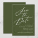 Eleganten sparar datumet med "Spara datumet" som visas i ett vitt kalligrafiskt skript med oliv grönt bakgrund. Anpassa kalligrafin spara datumet med namn, bröllop-datum och plats samt bröllop webbplats. Den icke-fotodesignade koordinaten med vår Elegant Calligraphy bröllop-samling.