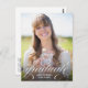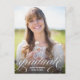 Denna eleganta examenskort har vacker vit kalligrafi och ett stort foto. Den vita skrivstilens bokstäver längs ner läser "Examen" med gemener dekorerade med eleganta svep. Lägg till examenpersonens namn och examensår på framsidan under typografidesignen. På baksidan av examenskortet kan du lägga till ett meddelande till mottagarna och/eller information om examensfesten.