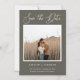 Rustik magnet för "save the date" med foto med grön och brun bakgrund och elegant kalligrafi-typografi. Denna magnet för "save the date" till bröllop kombinerar varma jordtoner med en tidlös och sofistikerad typsnittsstil, perfekt för rustika bröllop, utomhusfiranden eller naturinspirerade evenemang.