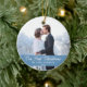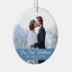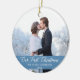 Elegant kalligrafi skrift Vårt första jul foto ljusblå prydnad med snöflingor på baksidan - Perfekt för ett bröllopsfoto eller parfoto