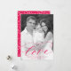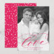 Elegant Alla hjärtans dagskort med lodräts foto med "kärlek" som visas i ett shock rosa-kalligrafiskript med en vit övertoning som tillval. Anpassa alla hjärtans fotokort med anpassningsbarna hälsning och ditt namn. Fotokortet för alla hjärtans dag återgår till visningen för en lekfull shock rosa och ett vitt hjärta mönster.