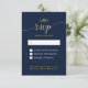 Denna guld- och marinblå bröllop RSVP-kortdesign har en vacker gulds typografi och eleganta grafiska element. Fler matchande föremål finns i min "Elegant klassisk bröllopssamling". BaraBomWedding