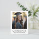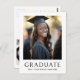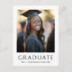 Examens tackkort med ditt foto och texten "examen" i en elegant font med ditt år och skolans namn nedan. Ytterligare foto och anpassat tackmeddelande på baksidan. Svart text på vit bakgrund.