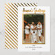 Elegant och klassiskt stiliserad vit och falskguld-folie foto-helgdesign med en falsk guld-folie ram framtill för ditt foto och hälsningen, "Julhälsningar" också i falsk guld-folie med falsk guld-folie och vita diagonala ränder på baksidan. Sammansatt design av Holiday Hearts Designs (upphovsrätt) med mall-foto via Unsplash.