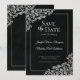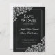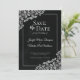 Denna vackra "save the date" för bröllop har en klassisk stil med spetsfiligransdetaljer och elegant, dekorativ typsnitt på en marmorerad bakgrund. Formuleringen är formell och traditionell.