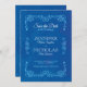 Denna vackra spara-datum-inbjudan till bröllop har en klassisk stil med spetsfiligran och fin skriptbokstav på en marmorerad bakgrund. Formuleringen är formell och traditionell.