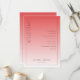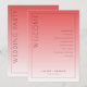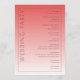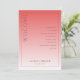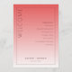 Detta bröllopsprogram har en minimalistisk och elegant design med en vertikal layout, uppdelad i två sektioner genom en gradientfärgövergång från djupt korallrosa till ljusare persikorosa. Den vänstra sidan visar framträdande ordet "VÄLKOMMEN" i fet, versal serifstil, medan den högra sektionen listar ceremonihändelser i ett strukturerat, centrerat format med gott om utrymme för läsbarhet. Anpassningsbara platshållare möjliggör personalisering med namn och datum längst ned i mitten, vilket ökar dess mångsidighet. Den rena, moderna estetiken använder negativt utrymme effektivt och skapar en sofistikerad och formell stämning som är lämplig för en viktig ceremoniell tillställning.