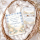 En mjuk kustdesign med en elegant oval krans sammansatt av snigelskal, ostron, sjöstjärna, havsglas och ömtåliga dyngräs. Neutrala sandiga nyanser smälter vackert samman med dämpade blåa accenter och skapar en raffinerad strandestetik som känns luftig och sofistikerad. Den varma elfenbensfärgade bakgrunden framhäver de naturliga texturerna samtidigt som den håller layouten ren och graciös. Perfekt för en strandinspirerad fest med tidlös, återhållen charm.