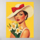 En glamorös kvinna i en vit hatt med en röd bukett som håller en bukett av gult och vita daffodils mot en pulserande bakgrund av gulten.