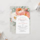 Med elegans och charm har denna vackra blommiga bröllopsfestinbjudan en vacker bukett av korallfärgade persikor och elfenbensvita akvarellpeoner, eukalyptus och rankor av grönska på en neutral ljusgrön bakgrund. Trendiga typsnittspar och en valvformad ram får din text att sticka ut med stil. Anpassa den lättanvända textmallen med dina evenemangsuppgifter. Goda nyheter! Du kan beställa denna inbjudan som en papperslös digital nedladdning för e-post till dina mottagare utöver de högkvalitativa tryckta inbjudningarna.