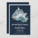 Elegant pension party inbjudan till för marscher frakt för kvinnor. Anpassa den med uppgifter om namn och party, inklusive datum, kryssningsrad, avgångshamn, OSA och all annan information som behövs. Konstruktion med en vattenfärgsbåt och vackra blommor på en marin blå bakgrund och närmare uppgifter om silver.