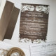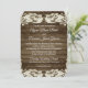 Gamla land-chicens bröllopsinbjudan med romantisk vintage elegans med lacy romantic vintage blommigt och en vacker mörk-lada-träkontrast. Det finns inget att skämmas för bröllopsinbjudan, boho land charming.