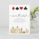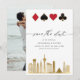 Modern, elegant Las Vegas Destination Wedding-fotot sparar datumkortet. Utformningen har Las Vegas City Skyline In guld, klubbar, diamanter, hjärtan och spade-ikoner i guld elegant ram och bröllop i trendigets text på framsidan. Lägg till ditt favoritfoto på baksidan av datumkortet.