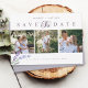 Elegant och rustik vattenfärgslavender med 3 fotokollage i vågrät format, typografi i dammig lila sparar datumkortet.