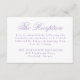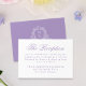Lägg till lite elegans i din bröllopsmottagning med det här vackra lavandekortet. På designens framsida finns frasen "Mottagning" i delikat lavendelcalligrafi på en vit bakgrund. Nedan kan du inkludera alla viktiga mottagningsdetaljer, t.ex. platsinformation, tider och speciella instruktioner för gästerna. På baksidan visningar kortet din anpassningsbar monogram initialer omgiven av en vit blommigt vapensköld på en mjuk lavenderbakgrund, med namn och bröllop-datum som visas elegant nedan. Detta mottagningskort är ett snyggt för viktig händelseinformation med dina gäster.