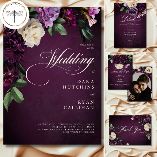 Elegant Lavender & Burgundy Blommigt Bröllop Spara Datumet